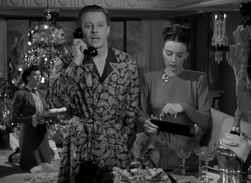 | Wayne is already in his pajamas when Nicki calls on Christmas Eve. His fiancee Joyce Williams (Patricia Morison) is there along with Miss Fletcher (Jacqueline DeWitt) opening presents. |